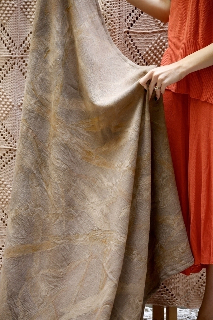 Estampado à mão, com a técnica de impressão botânica, com cascas da árvore de eucalipto.