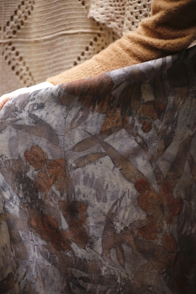 Estampado à mão, com a técnica de impressão botânica, com dois tipos de folhas de eucalipto.